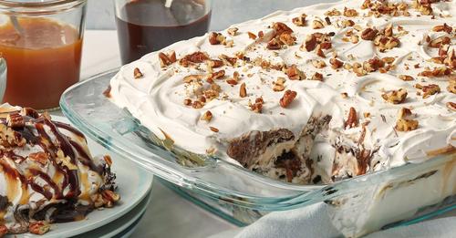 Arrange a layer of ice cream sandwiches in the bottom of a 9x13-inch dish; top with a layer of whipped topping, hot fudge topping, and caramel topping. Repeat layering with remaining ice cream sandwiches, whipped topping, hot fudge topping, and caramel topping, ending with a top layer of whipped topping. Sprinkle with pecans.